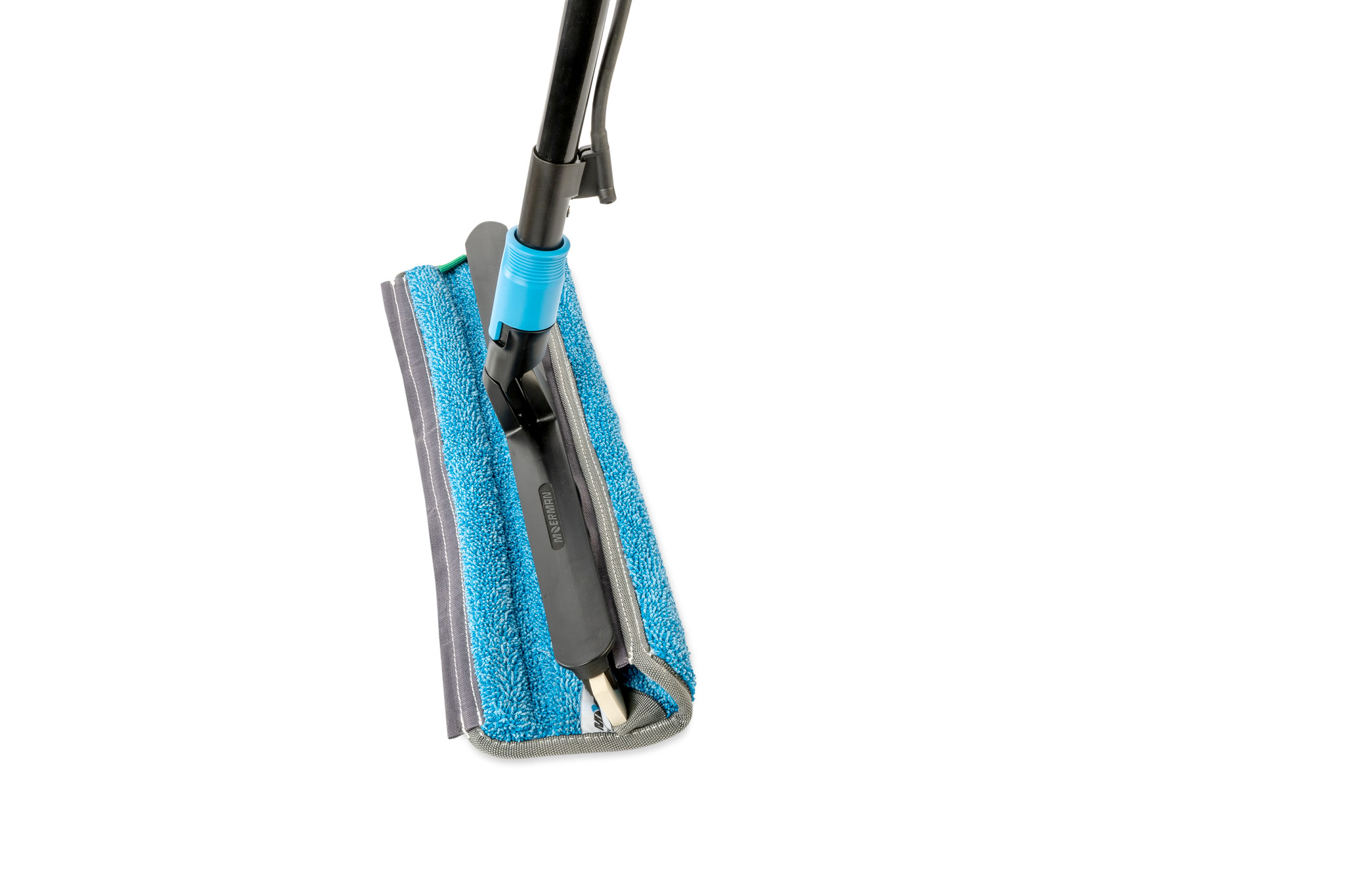 Spraymop "CARABAO" für den Profi! Einfache Mop-Befestigung dank Magnetverbindung, kein Bücken, keine schmutzigen Hände, für Feucht- und Nassreinigung, mit gebogenem, triovalem, ergonomisch geformtem Teleskopstiel und rotierendem Handgriff, Sprayfunktion mit abnehmbarem Wassertank mit Skala für Dosierung, doppelte Flächenleistung durch 2-seitiger Anwendung, 6 Reinigungszonen pro Mop, inklusive Wasserschieber zu Verwenden ohne Mop. Schauen Sie sich das Video an.